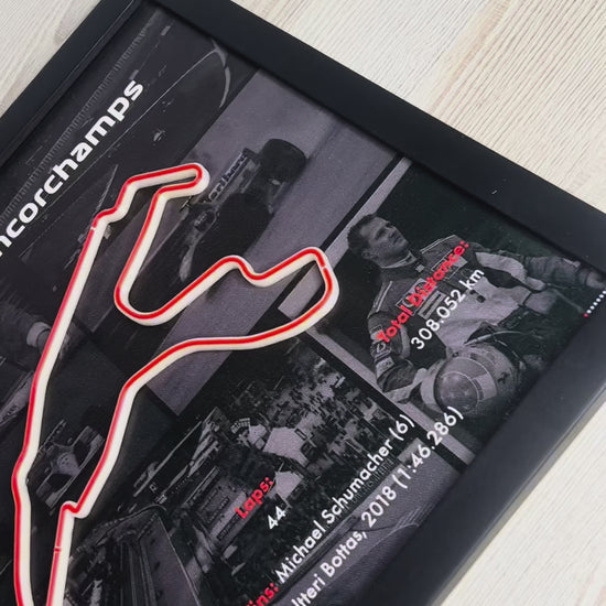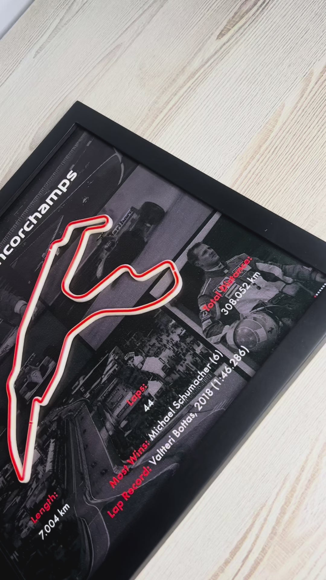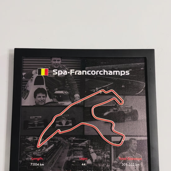 Printed on museum-grade canvas and finished with a premium wood frame, it captures Spa’s epic 7.004 km layout across 44 laps, totaling 308.052 km of pure motorsport history. Honoring its legends, the piece highlights Michael Schumacher’s six victories and Valtteri Bottas’ 2018 lap record (1:46.286).