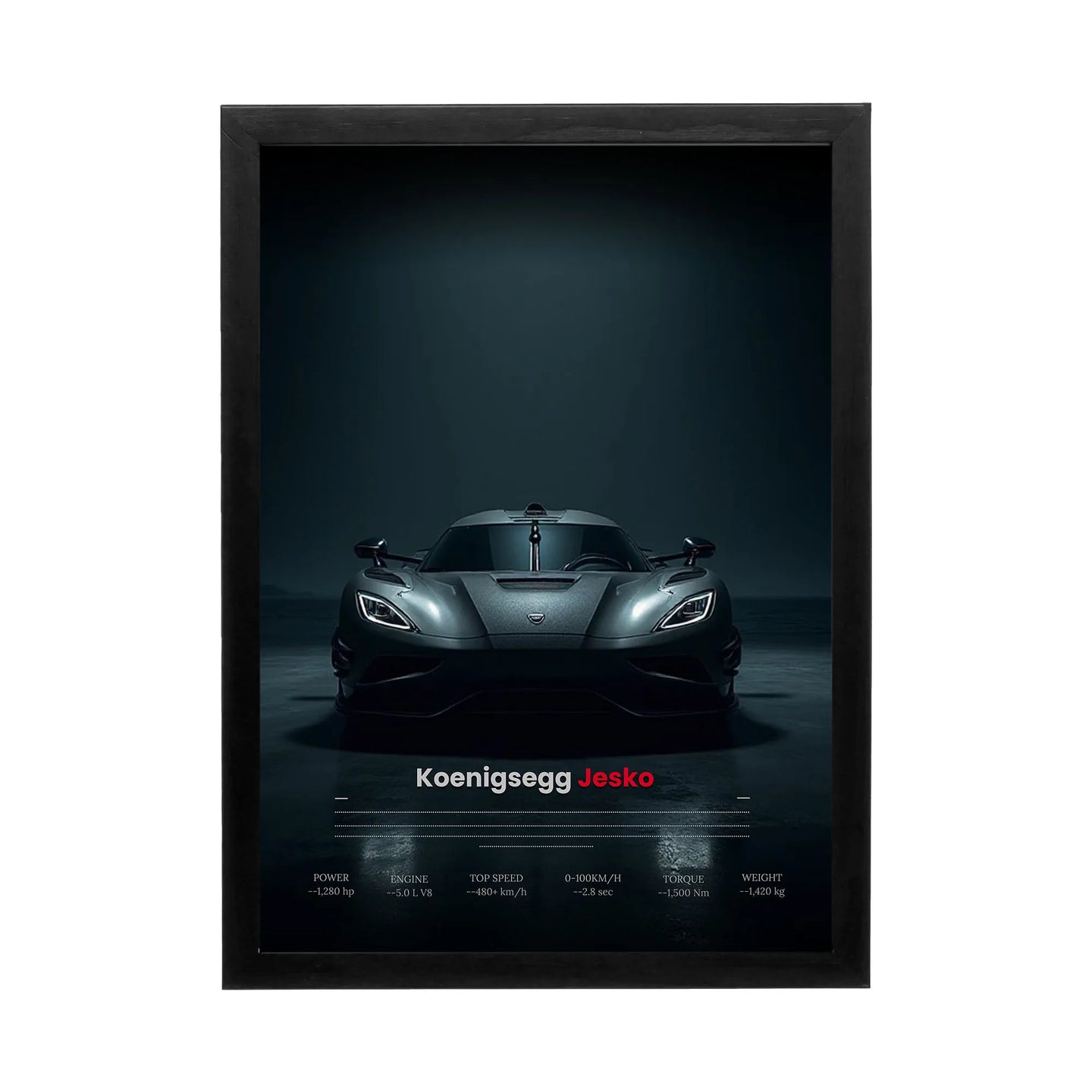Experience the raw power and innovation of the Koenigsegg Jesko with this stunning poster. Capturing the fierce elegance and cutting-edge technology that defines this supercar, the design harmonizes striking visuals with vital specifications, such as 1,250 hp and a top speed of 480 km/h. Hang this piece on your wall as an homage to automotive excellence, perfect for any car enthusiast looking to elevate their space with a touch of speed and sophistication.