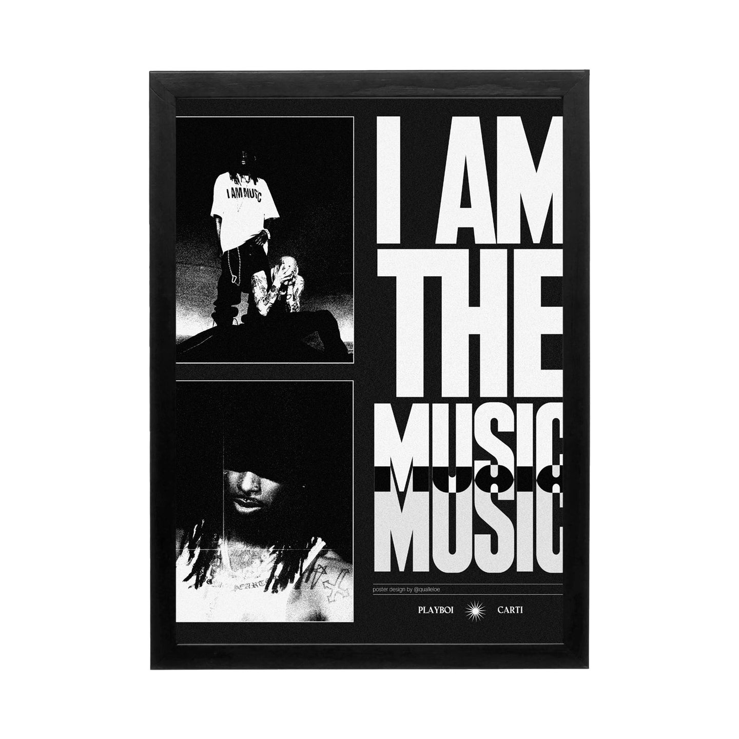 Dive into the essence of musical innovation with this stunning design featuring PLAYBOI CARTI. The bold text 'I AM THE MUSIC' encapsulates the artist's identity and the spirit of his work. This striking visual celebrates not just the man, but the movement he embodies within modern hip-hop. The monochrome aesthetic evokes a sense of nostalgia while maintaining an edgy contemporary vibe, making it a perfect addition to any space. Whether you're a dedicated fan or simply appreciate the artistry of music, this piece speaks to the power and emotion behind every note.